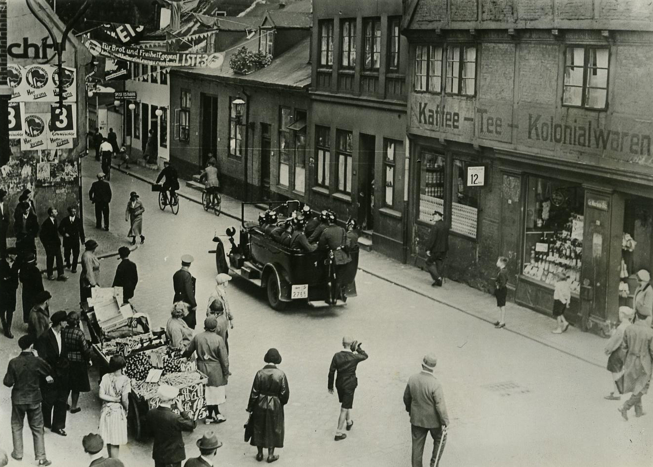 Ja sicher, manche Rätsel lassen sich mit Hilfe des Agora Adressbuches der Uni Hamburg lösen. Das Polizeifahrzeug fährt durch die Marienstrasse (Große). Heute würde man schreiben: Große Marienstr. Das war offensichtlich 1932 noch nicht Mode. Der Kaffee Tee Kolonialwarenhändler, dessen Laden man auf der rechten Straßenseite sieht, gehört Alwin Raupert, der sich als Kolonialwarenhändler in das Adressbuch eintragen ließ. Das Geschäft in der Großen Marienstraße Nr. 31 (abgekürzt auf dem Straßenschild Gr. Marienstr.) ist die Filiale eines größeren Geschäftes, das Alwin Raupert in der Johannisstraße (Große) Nr. 42 betreibt. Dort gehört ihm auch das Haus. Seine Wohnung ist in der Christianstraße 22. Damit wären alle Unklarheiten beseitigt. Die Eintragungen betreffen die Jahre 1930, 1931 und 1932. Ob dieser Mensch etwas gesehen hat, ist nicht überliefert. Aber wenigstens wissen wir, wo das Foto aufgenommen wurde und durch welche Straße das Polizeifahrzeug fährt. Das Polizeifahrzeug fährt durch die Große Marienstraße in Richtung Kleine Freiheit, wo die Große Marienstraße endet.