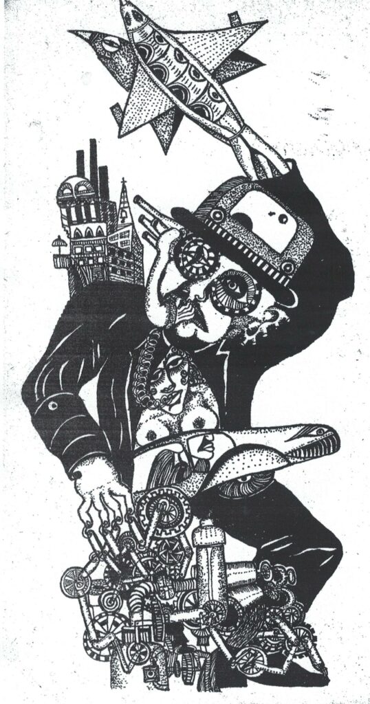 Grafik aus dem Rotbuch 19 „Versuch über Gebrauchswert“ von Horst Kurnitzky, Verlag Klaus Wagenbach, 1970, Grafik von Natascha Ungeheuer Frontispizgraphik