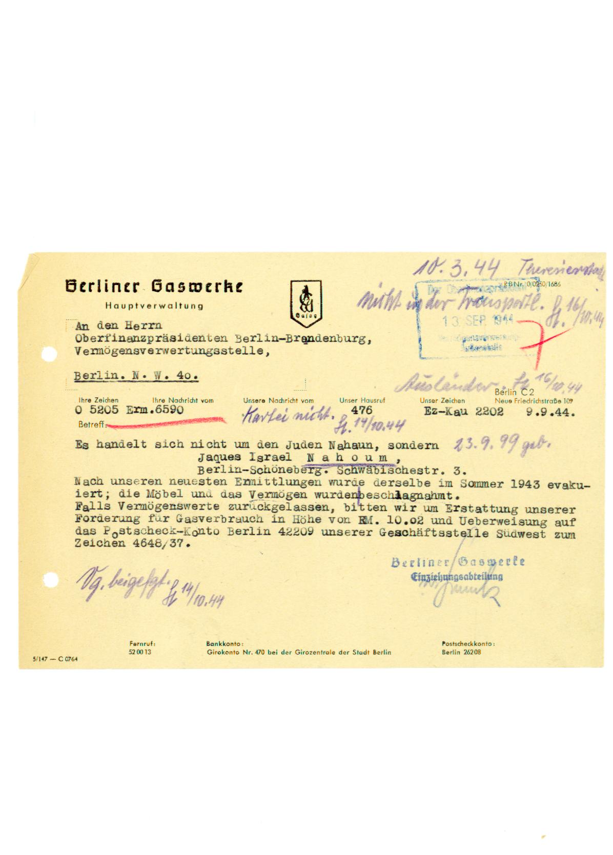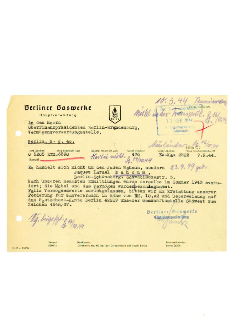 Brief der Berliner Gaswerke vom 3. September 1944 an den Oberfinanzpräsidenten Berlin Brandenburg (Die Ausplünderungsbehörde der Nazis)